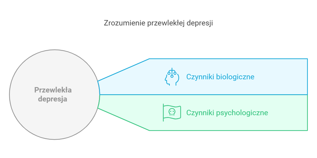 - Przyczyny przewlekłości depresji są złożone – obejmują czynniki biologiczne (np. zmiany w neuroprzekaźnikach), psychologiczne (negatywne schematy myślowe) i społeczne (izolacja i brak wsparcia).
