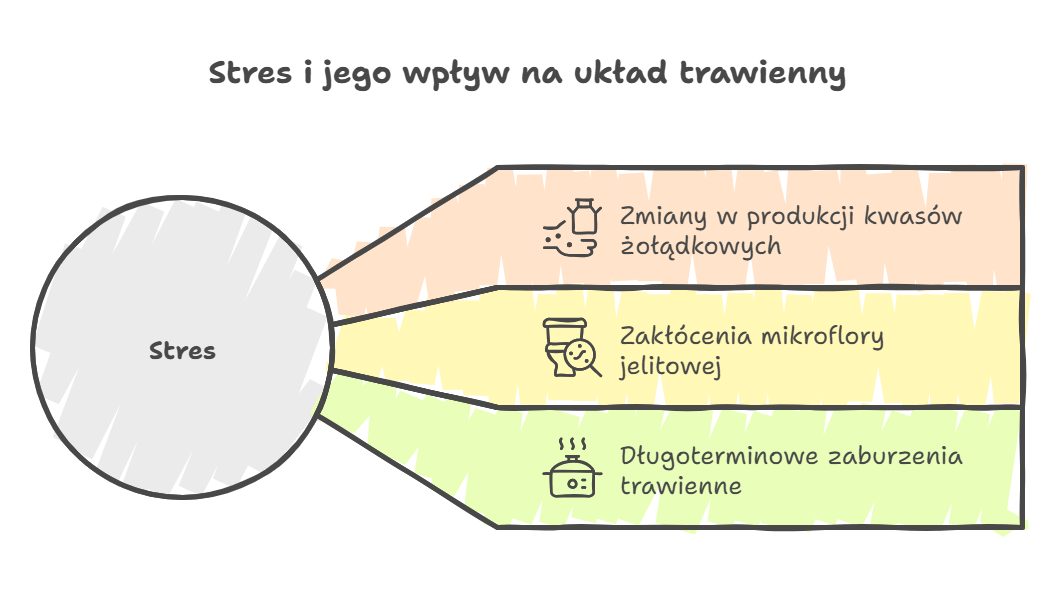 Stres wpływa na układ trawienny, powodując nadmierną produkcję kwasów żołądkowych i zaburzając równowagę mikroflory jelitowej. To z kolei może prowadzić do dolegliwości żołądkowych, takich jak ból brzucha, wzdęcia i nudności.