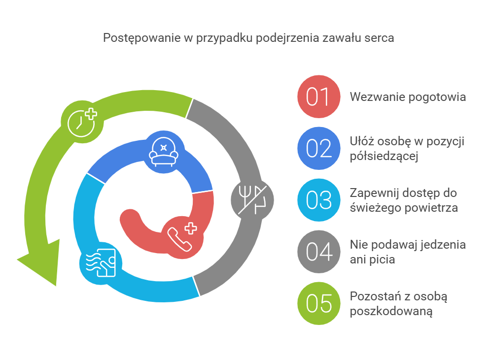 ⏱️ PAMIĘTAJ: W przypadku zawału serca, czas od wystąpienia objawów do rozpoczęcia leczenia nie powinien przekraczać 60 minut. Jest to kluczowe dla ograniczenia obszaru martwicy mięśnia sercowego i zwiększenia szans na przeżycie.