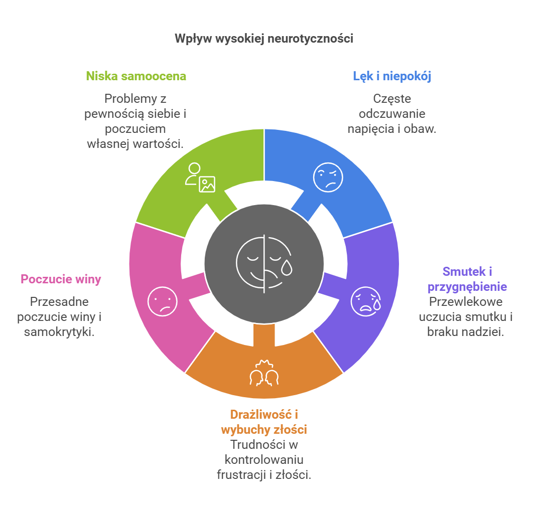 Osoby o wysokim poziomie neurotyczności często doświadczają intensywniejszych reakcji na stres. Może to prowadzić do: